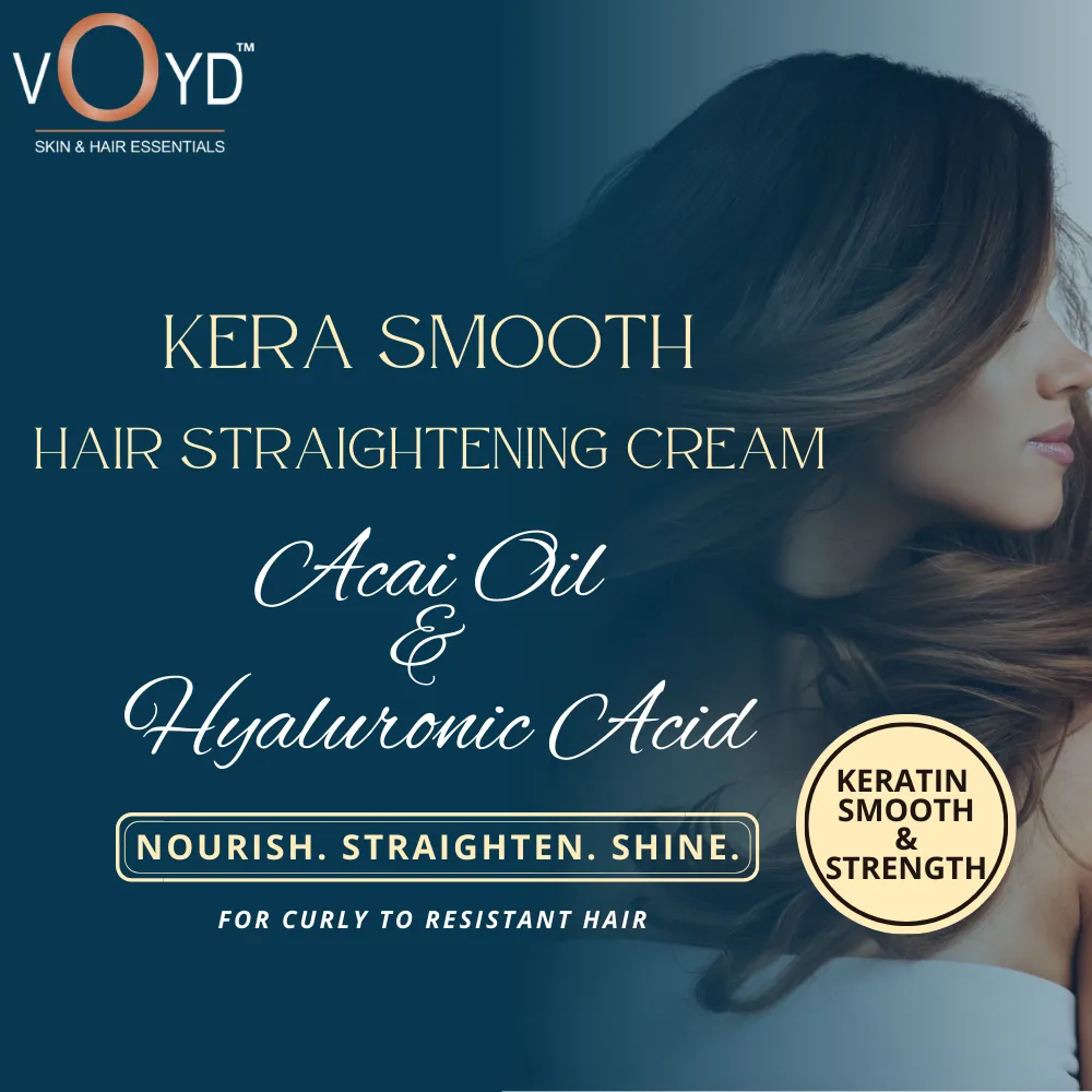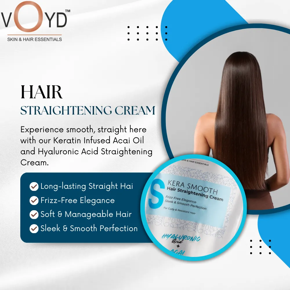 • ADDS NATURAL SHINE & VIBRANCY – VOYD Kera Smooth Hair Straightening Cream is formulated with Acai Oil, Hyaluronic Acid, and Keratin to enhance hair gloss for a healthy & radiant look. This nourishing blend locks in essential moisture, keeping hair soft and silky while maintaining a sleek, straight look. Perfect for dry and resistant hair, it works from root to tip, replenishing lost proteins and nutrients while ensuring a smooth and frizz-free transformation with lasting shine.